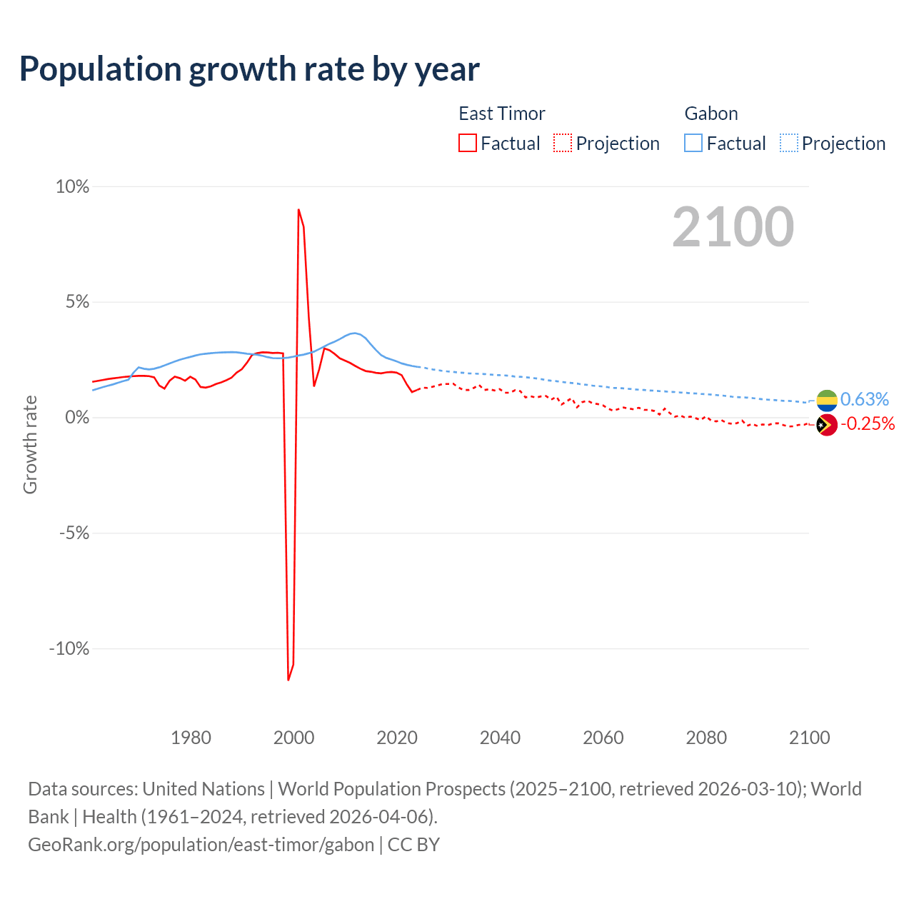- For the last 10 years, East Timor has had an average growth rate of +1.74% per year vs +2.61% in Gabon.