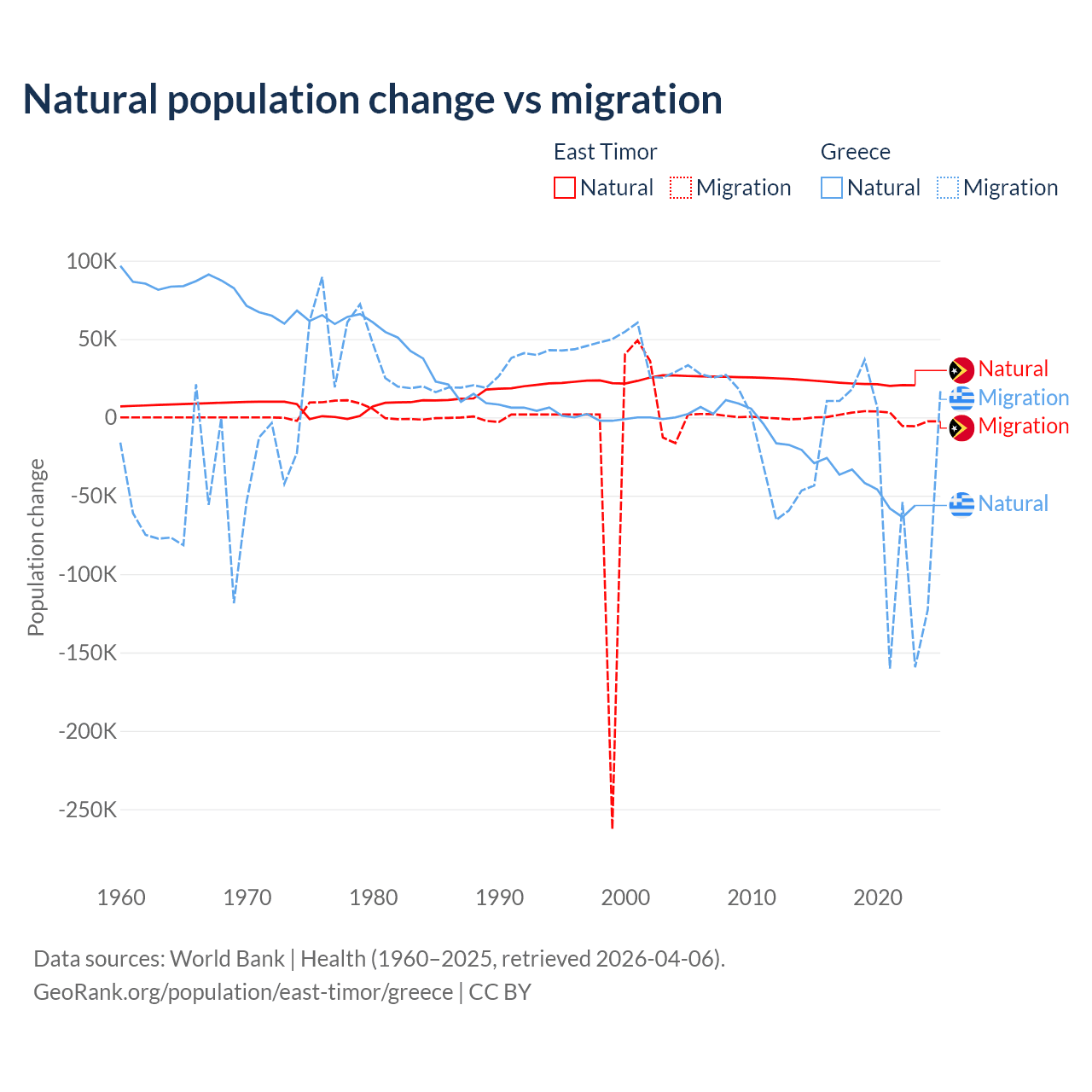 Over the last 10 years, 98.3% of the population change in East Timor is from natural causes (a gain of 217,698 people) and 1.66% is from migration (a gain of 3,665 people). In Greece 51.9% is from natural causes (a loss of 411,426 people) and 48.1% is from migration (a loss of 381,824 people).