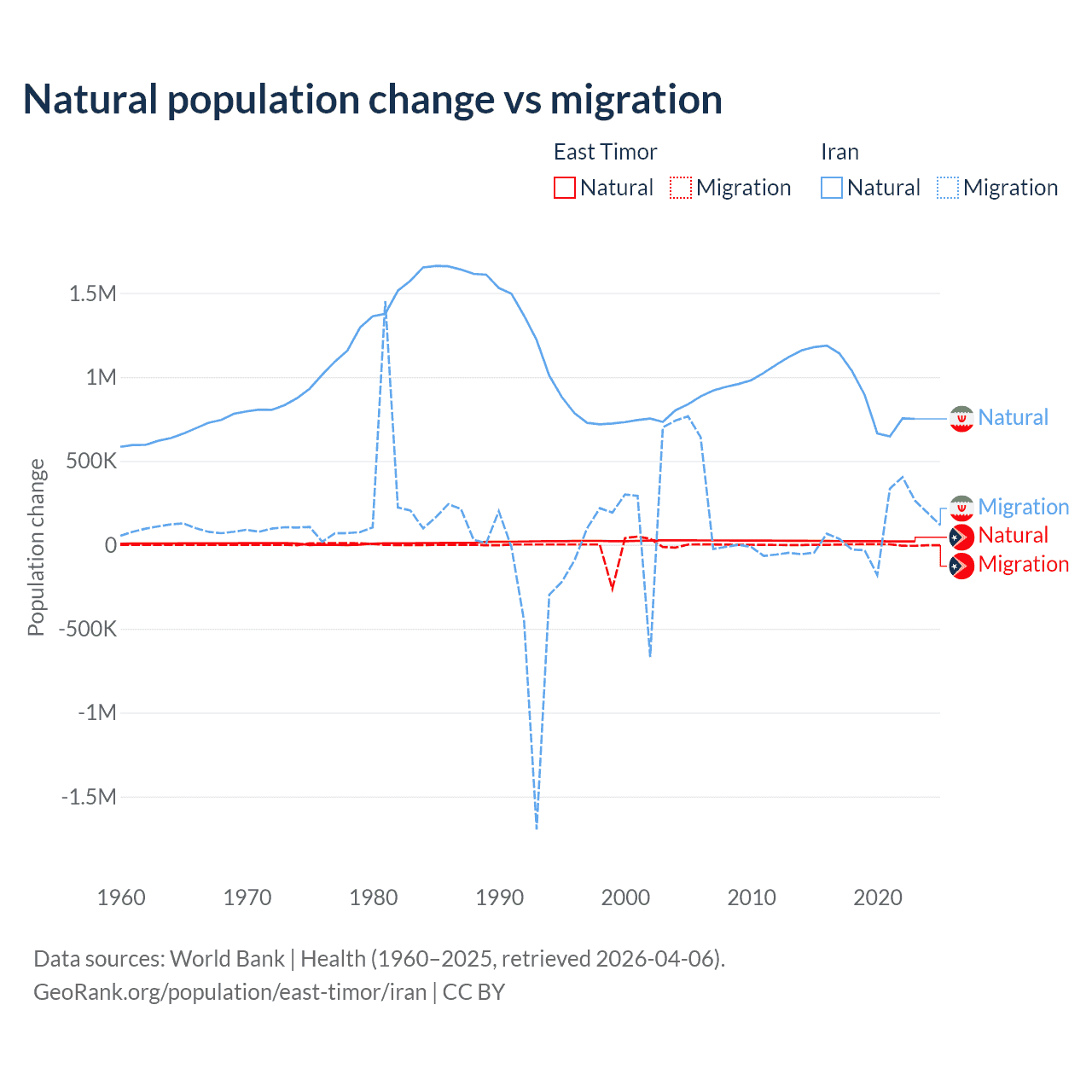 Over the last 10 years, 98.3% of the population change in East Timor is from natural causes (a gain of 217,698 people) and 1.66% is from migration (a gain of 3,665 people). In Iran 92.5% is from natural causes (a gain of 9,405,860 people) and 7.46% is from migration (a gain of 757,979 people).