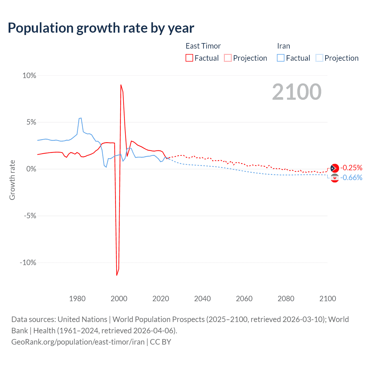 - For the last 10 years, East Timor has had an average growth rate of +1.74% per year vs +1.19% in Iran.