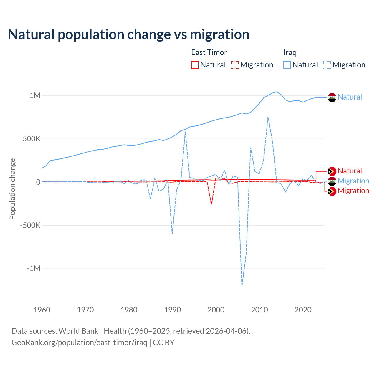 Over the last 10 years, 98.3% of the population change in East Timor is from natural causes (a gain of 217,698 people) and 1.66% is from migration (a gain of 3,665 people). In Iraq 99.2% is from natural causes (a gain of 9,598,842 people) and 0.76% is from migration (a loss of 73,050 people).