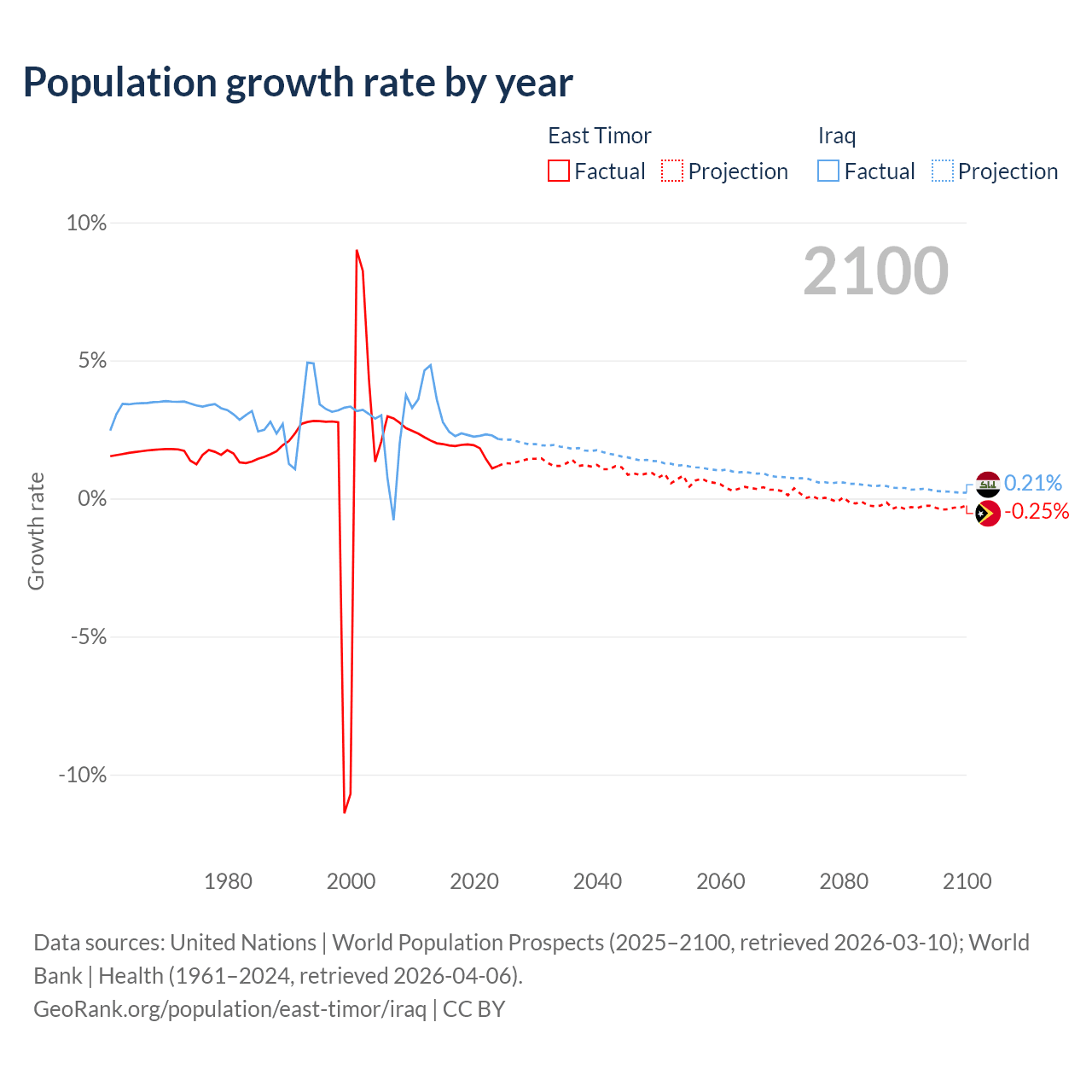 - For the last 10 years, East Timor has had an average growth rate of +1.74% per year vs +2.45% in Iraq.