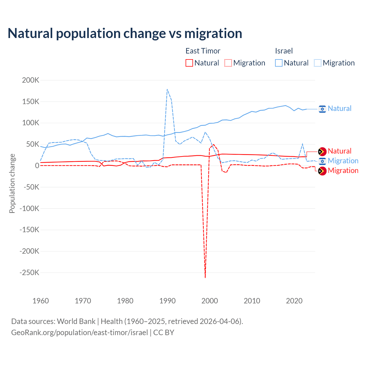 Over the last 10 years, 98.3% of the population change in East Timor is from natural causes (a gain of 217,698 people) and 1.66% is from migration (a gain of 3,665 people). In Israel 86% is from natural causes (a gain of 1,343,492 people) and 14% is from migration (a gain of 219,048 people).