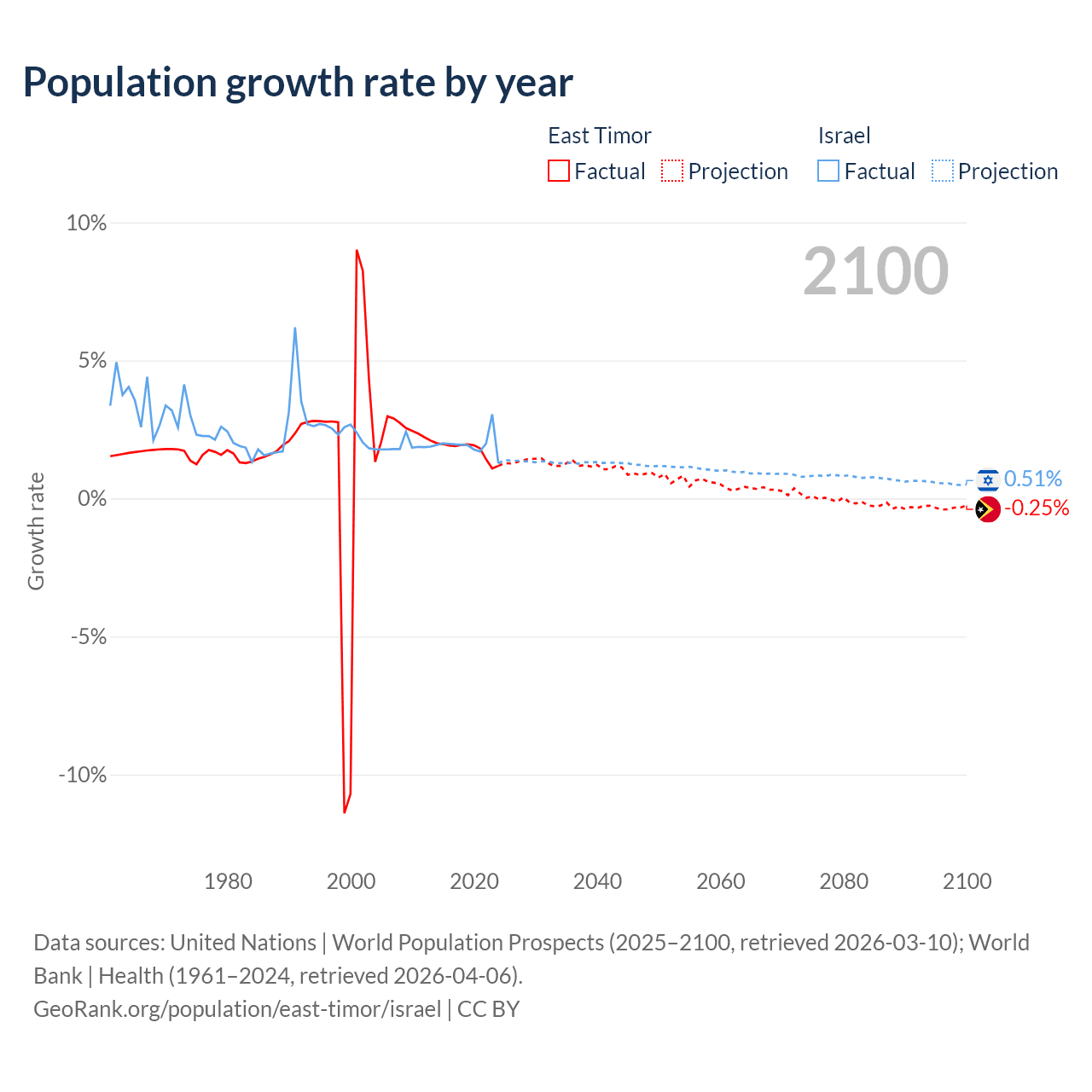 - For the last 10 years, East Timor has had an average growth rate of +1.74% per year vs +1.96% in Israel.
