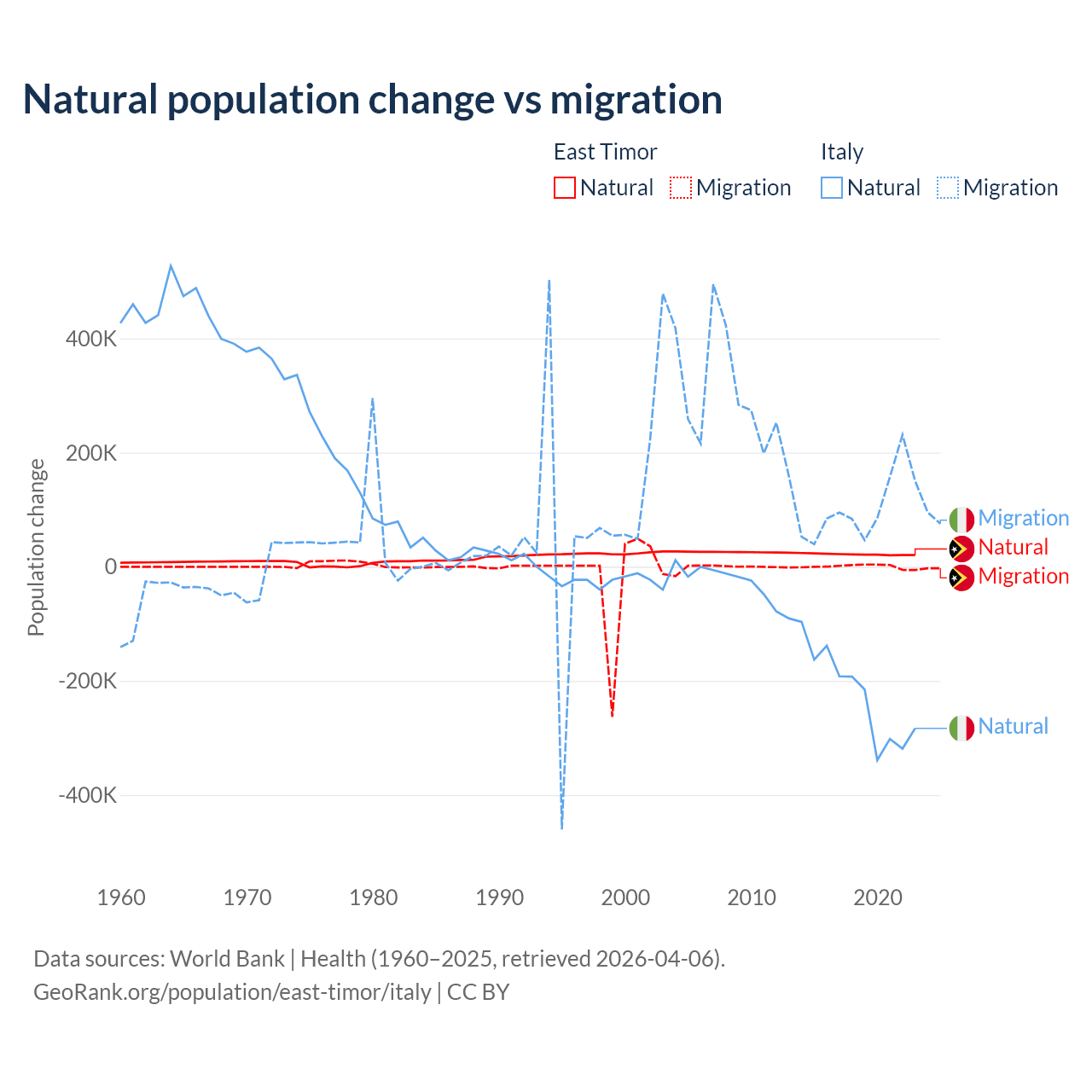 Over the last 10 years, 98.3% of the population change in East Timor is from natural causes (a gain of 217,698 people) and 1.66% is from migration (a gain of 3,665 people). In Italy 68.6% is from natural causes (a loss of 2,239,084 people) and 31.4% is from migration (a gain of 1,026,128 people).