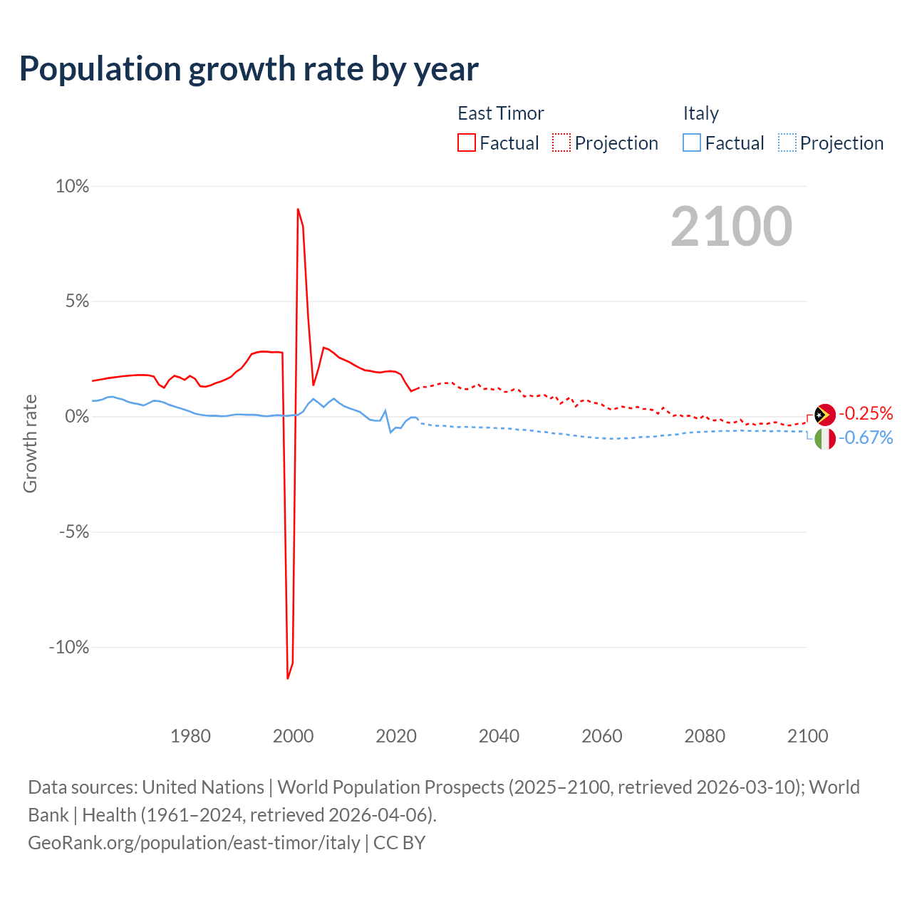 - For the last 10 years, East Timor has had an average growth rate of +1.74% per year vs -0.21% in Italy.