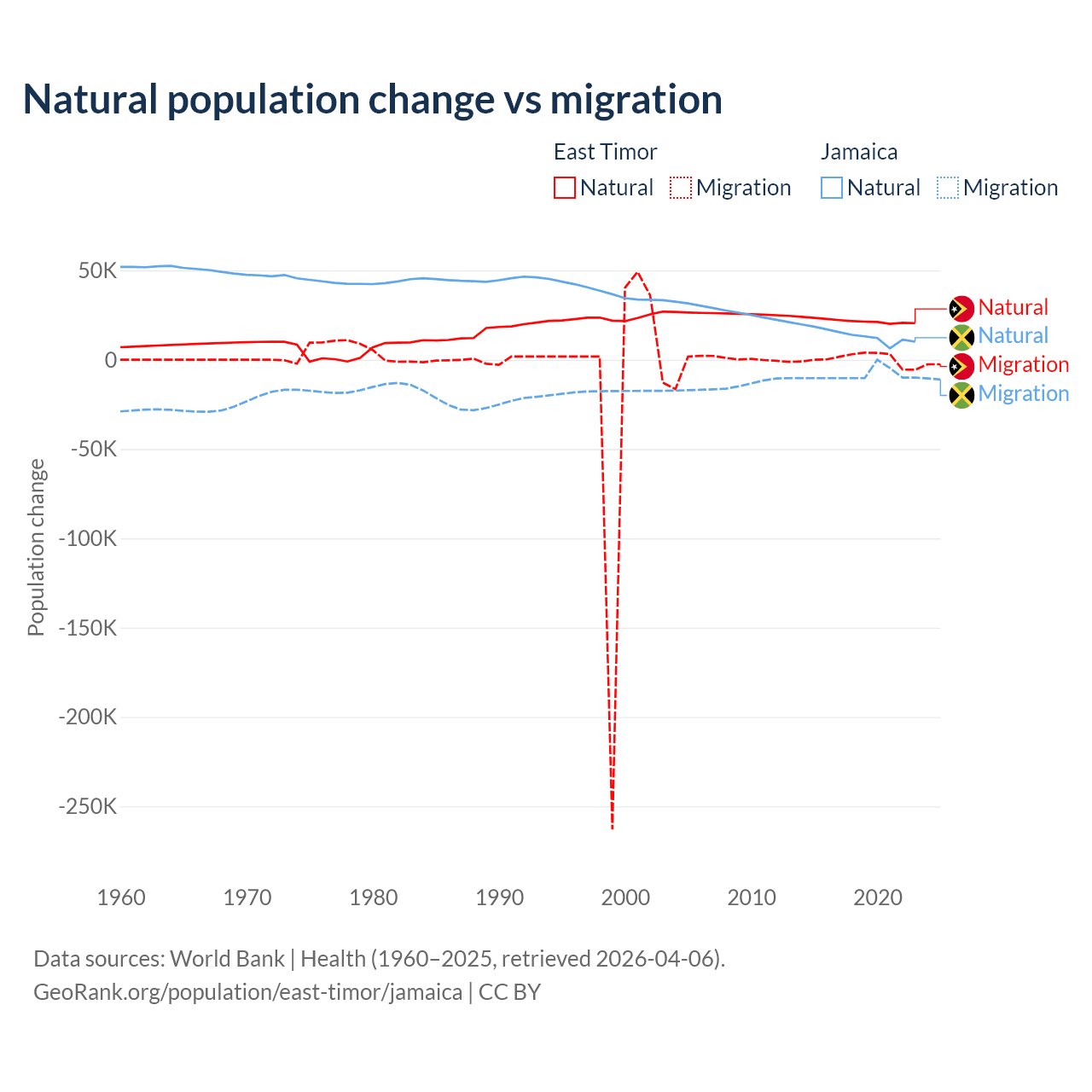 Over the last 10 years, 98.3% of the population change in East Timor is from natural causes (a gain of 217,698 people) and 1.66% is from migration (a gain of 3,665 people). In Jamaica 61.3% is from natural causes (a gain of 137,465 people) and 38.7% is from migration (a loss of 86,681 people).