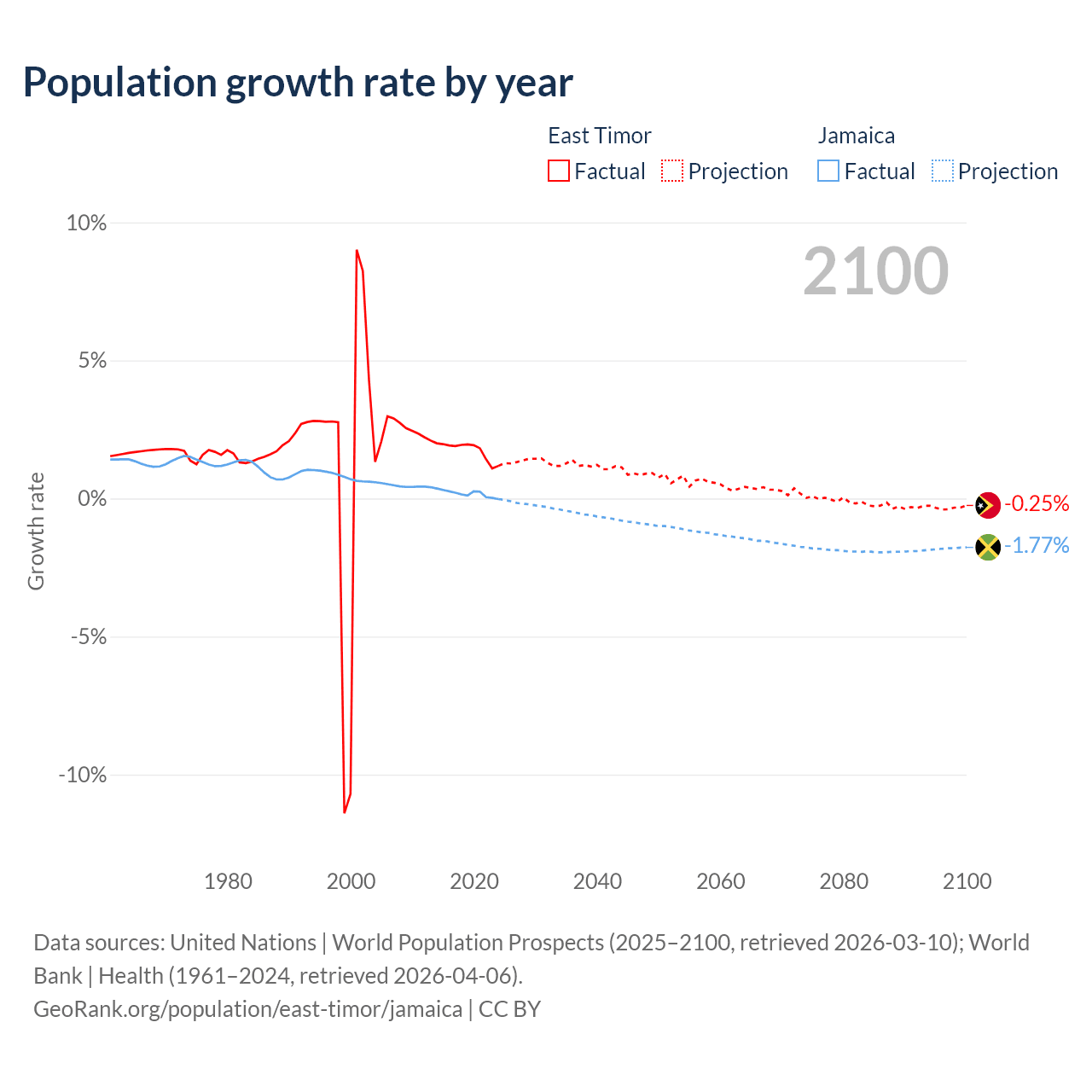 - For the last 10 years, East Timor has had an average growth rate of +1.74% per year vs +0.18% in Jamaica.