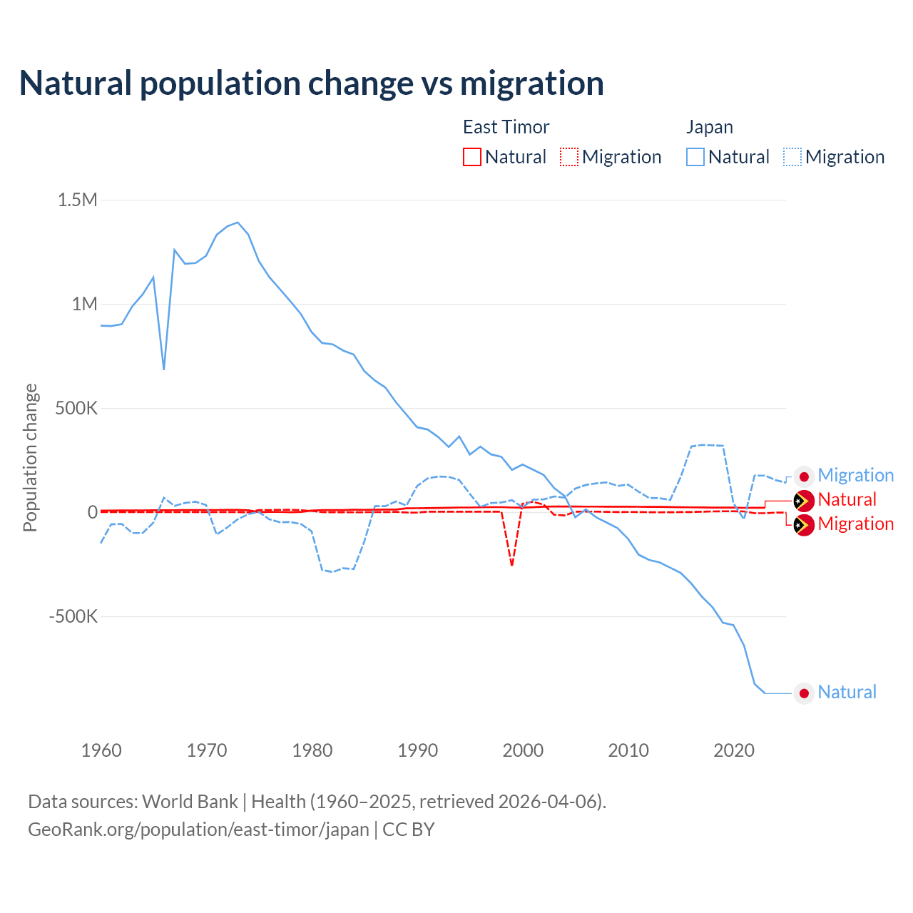 Over the last 10 years, 98.3% of the population change in East Timor is from natural causes (a gain of 217,698 people) and 1.66% is from migration (a gain of 3,665 people). In Japan 73.6% is from natural causes (a loss of 5,178,838 people) and 26.4% is from migration (a gain of 1,860,103 people).