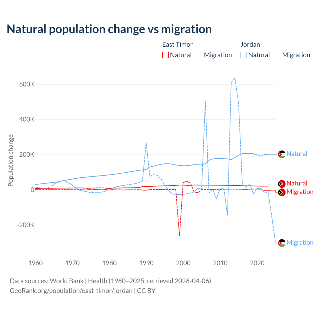 Over the last 10 years, 98.3% of the population change in East Timor is from natural causes (a gain of 217,698 people) and 1.66% is from migration (a gain of 3,665 people). In Jordan 63.2% is from natural causes (a gain of 1,991,452 people) and 36.8% is from migration (a gain of 1,157,625 people).