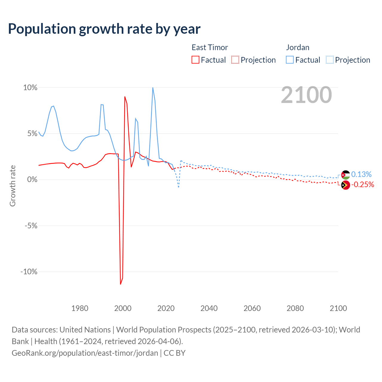 - For the last 10 years, East Timor has had an average growth rate of +1.74% per year vs +3.45% in Jordan.