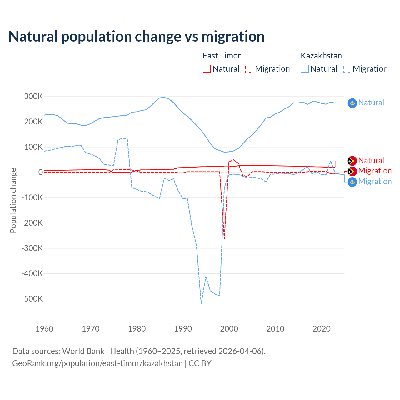 Over the last 10 years, 98.3% of the population change in East Timor is from natural causes (a gain of 217,698 people) and 1.66% is from migration (a gain of 3,665 people). In Kazakhstan 98.7% is from natural causes (a gain of 2,743,094 people) and 1.33% is from migration (a gain of 36,908 people).