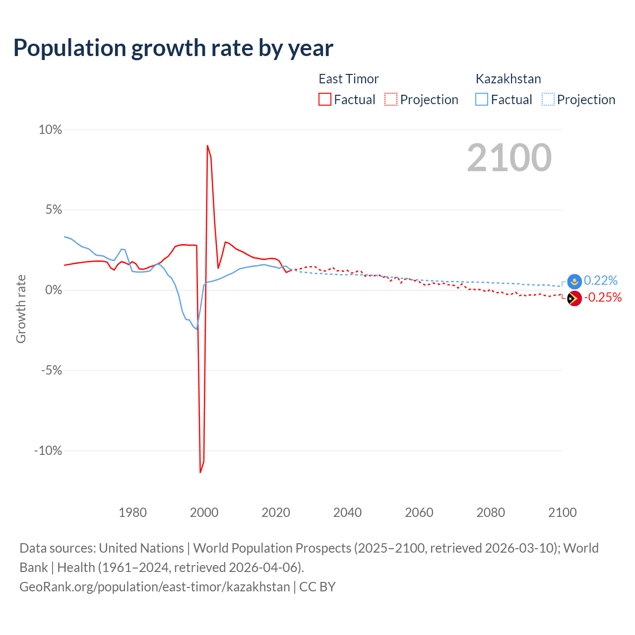 - For the last 10 years, East Timor has had an average growth rate of +1.74% per year vs +1.46% in Kazakhstan.