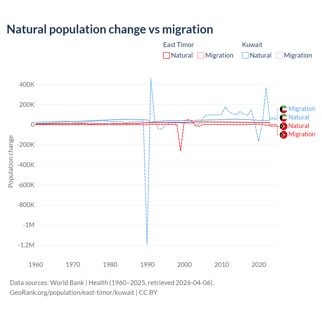 Over the last 10 years, 98.3% of the population change in East Timor is from natural causes (a gain of 217,698 people) and 1.66% is from migration (a gain of 3,665 people). In Kuwait 35.8% is from natural causes (a gain of 470,645 people) and 64.2% is from migration (a gain of 845,142 people).