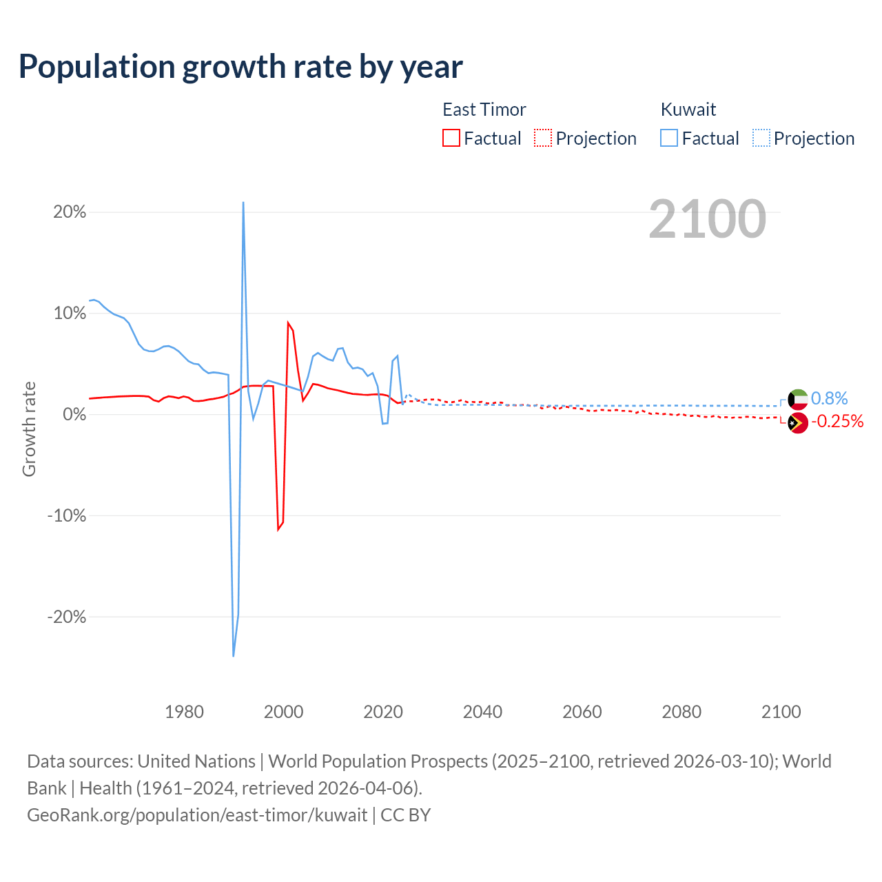 - For the last 10 years, East Timor has had an average growth rate of +1.74% per year vs +3.1% in Kuwait.