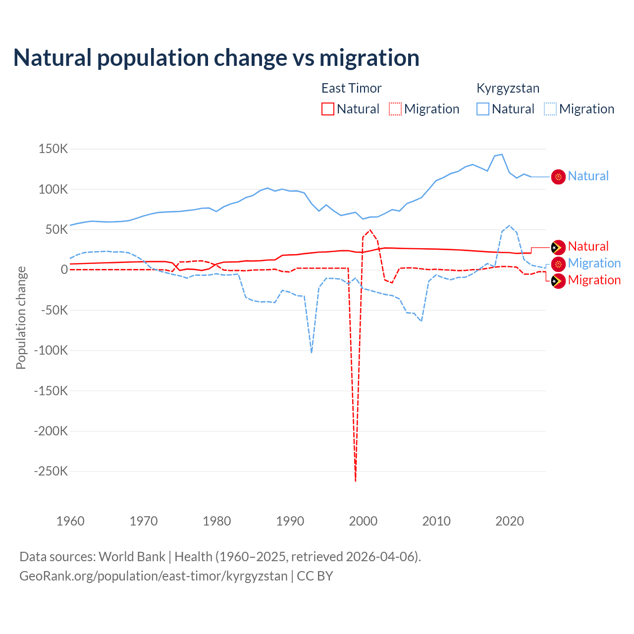 Over the last 10 years, 98.3% of the population change in East Timor is from natural causes (a gain of 217,698 people) and 1.66% is from migration (a gain of 3,665 people). In Kyrgyzstan 88.5% is from natural causes (a gain of 1,258,837 people) and 11.5% is from migration (a gain of 164,132 people).