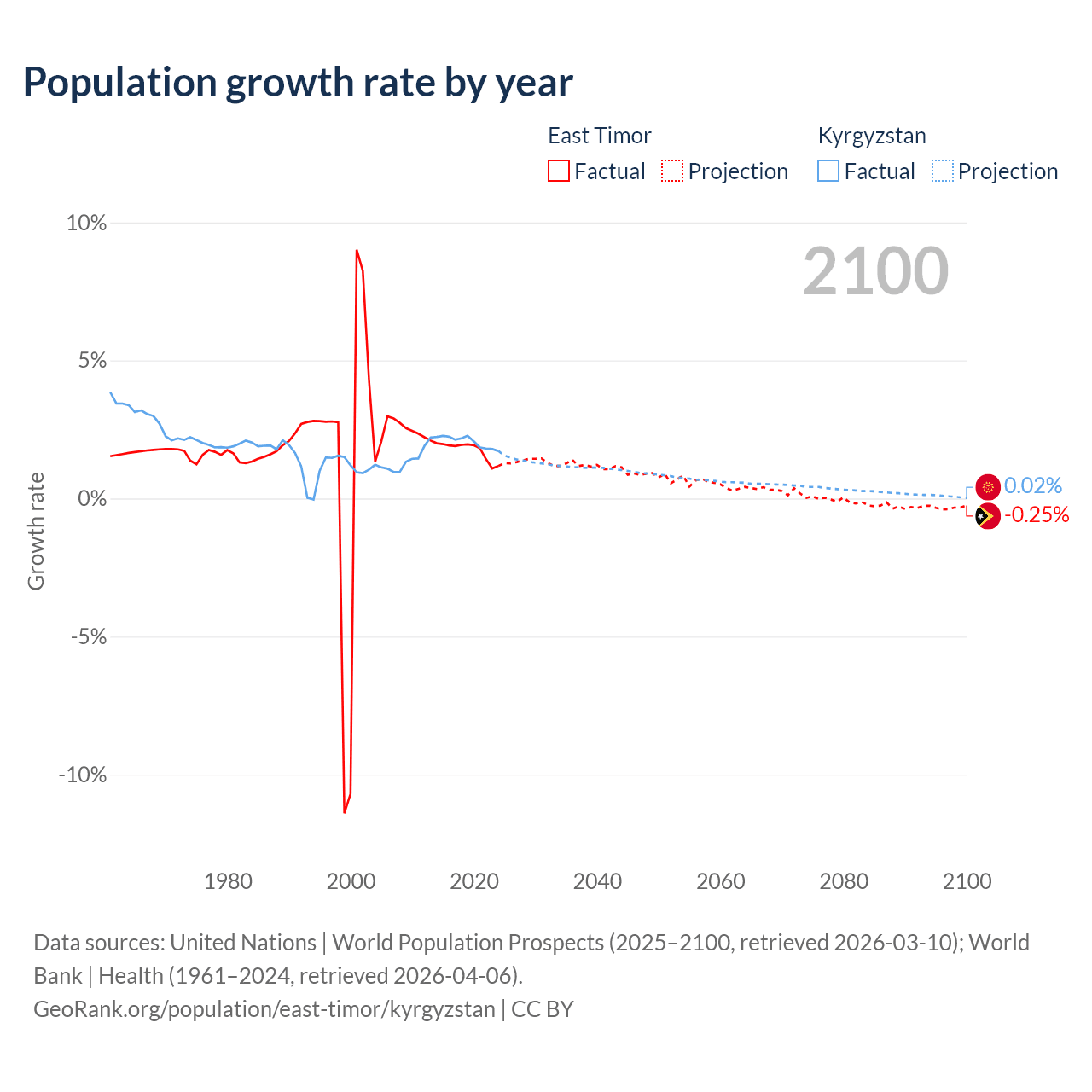 - For the last 10 years, East Timor has had an average growth rate of +1.74% per year vs +2.05% in Kyrgyzstan.
