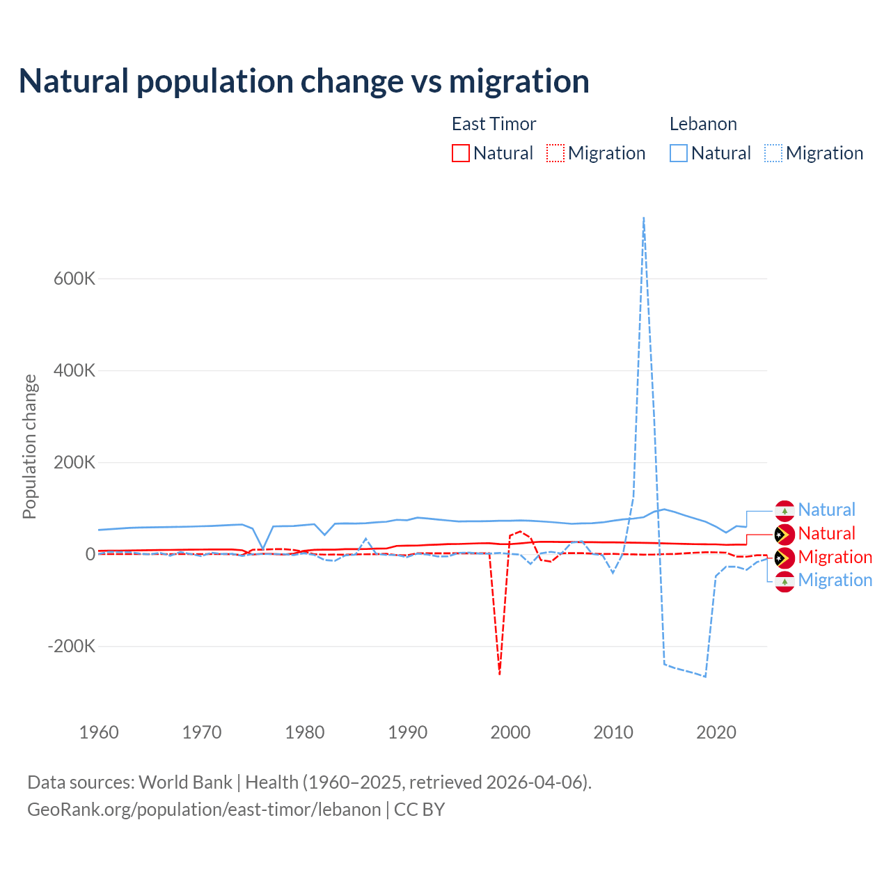 Over the last 10 years, 98.3% of the population change in East Timor is from natural causes (a gain of 217,698 people) and 1.66% is from migration (a gain of 3,665 people). In Lebanon 40.1% is from natural causes (a gain of 739,256 people) and 59.9% is from migration (a loss of 1,103,772 people).