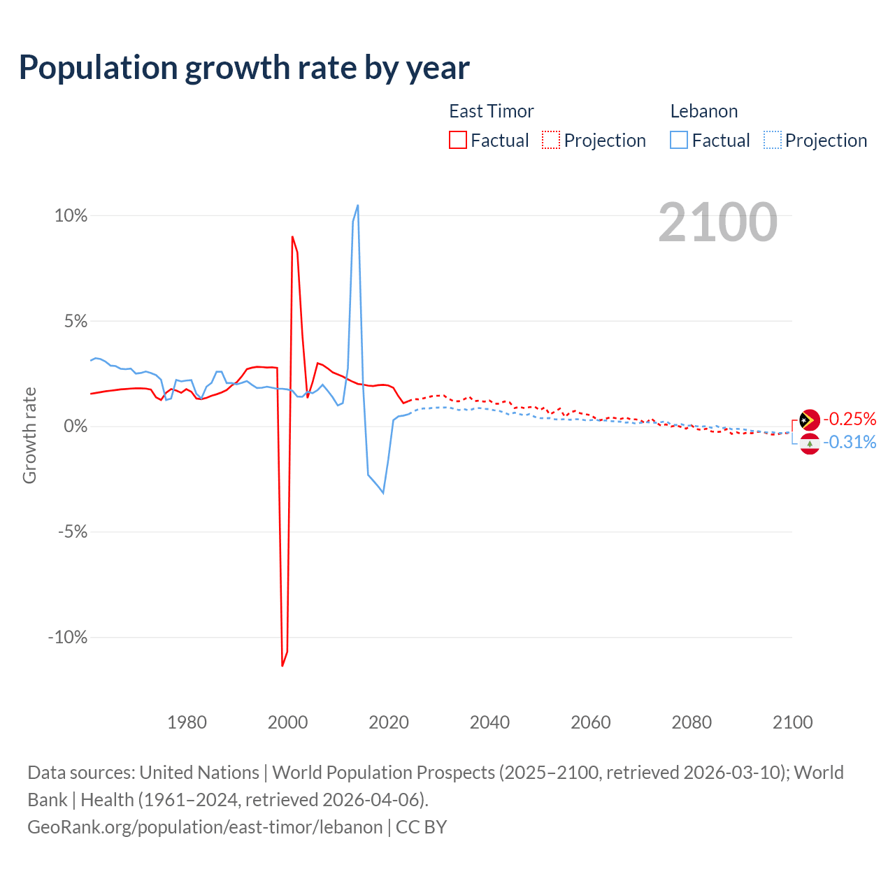 - For the last 10 years, East Timor has had an average growth rate of +1.74% per year vs +0.16% in Lebanon.