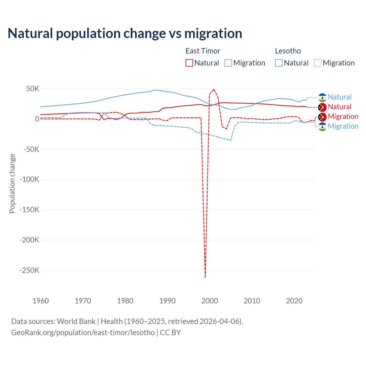 Over the last 10 years, 98.3% of the population change in East Timor is from natural causes (a gain of 217,698 people) and 1.66% is from migration (a gain of 3,665 people). In Lesotho 84.2% is from natural causes (a gain of 315,836 people) and 15.8% is from migration (a loss of 59,457 people).