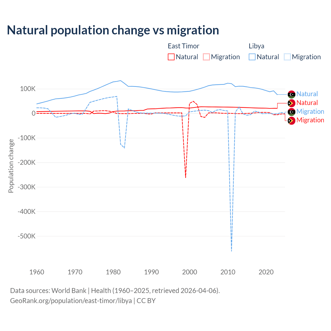 Over the last 10 years, 98.3% of the population change in East Timor is from natural causes (a gain of 217,698 people) and 1.66% is from migration (a gain of 3,665 people). In Libya 99.4% is from natural causes (a gain of 975,799 people) and 0.63% is from migration (a loss of 6,150 people).