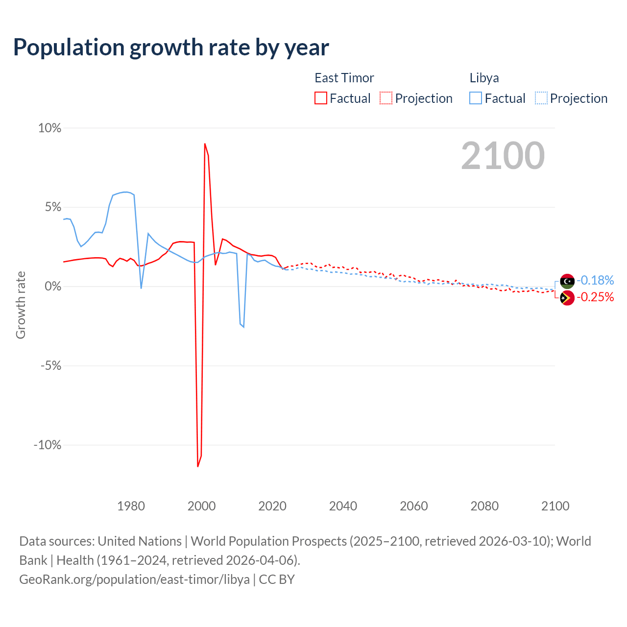 - For the last 10 years, East Timor has had an average growth rate of +1.74% per year vs +1.44% in Libya.