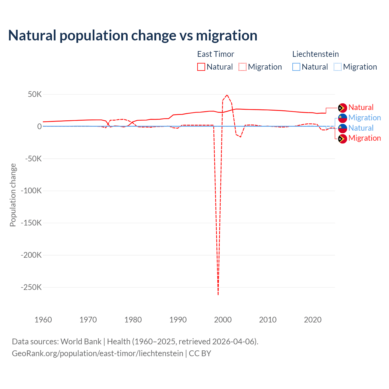 Over the last 10 years, 98.3% of the population change in East Timor is from natural causes (a gain of 217,698 people) and 1.66% is from migration (a gain of 3,665 people). In Liechtenstein 32.4% is from natural causes (a gain of 883 people) and 67.6% is from migration (a gain of 1,843 people).