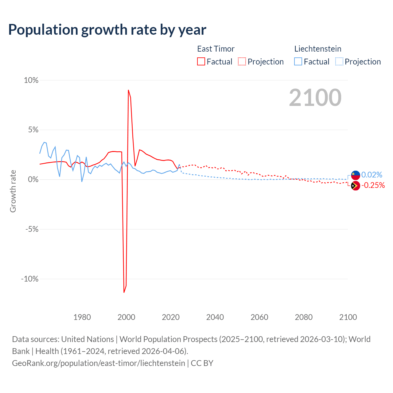 - For the last 10 years, East Timor has had an average growth rate of +1.74% per year vs +0.82% in Liechtenstein.