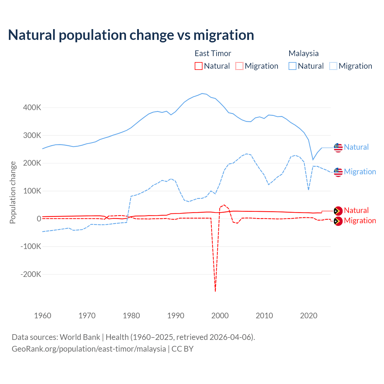 Over the last 10 years, 98.3% of the population change in East Timor is from natural causes (a gain of 217,698 people) and 1.66% is from migration (a gain of 3,665 people). In Malaysia 61.7% is from natural causes (a gain of 3,029,648 people) and 38.3% is from migration (a gain of 1,882,159 people).