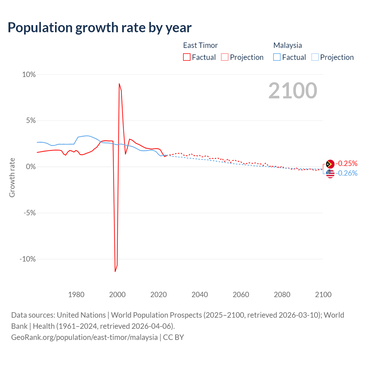 - For the last 10 years, East Timor has had an average growth rate of +1.74% per year vs +1.5% in Malaysia.