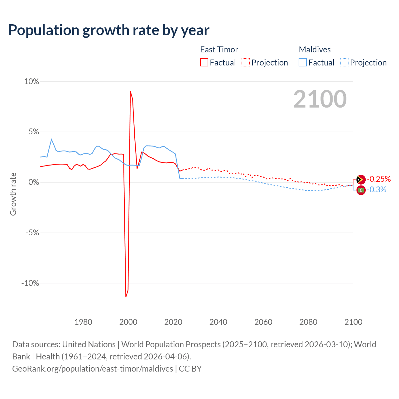 - For the last 10 years, East Timor has had an average growth rate of +1.74% per year vs +2.56% in Maldives.