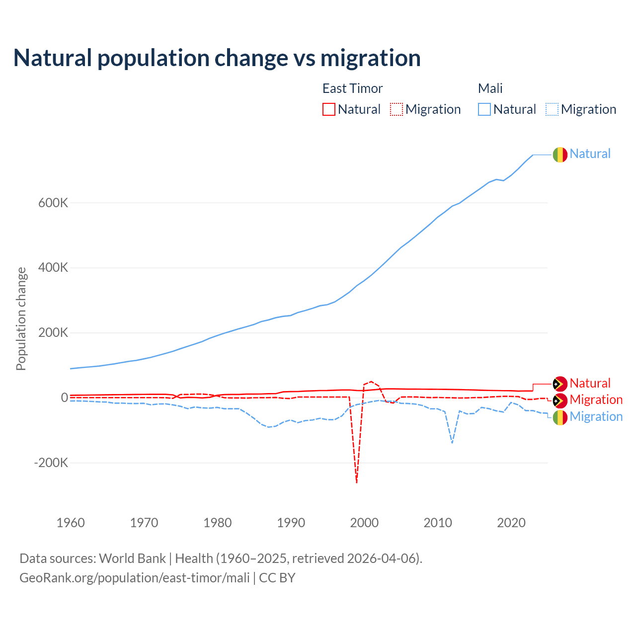 Over the last 10 years, 98.3% of the population change in East Timor is from natural causes (a gain of 217,698 people) and 1.66% is from migration (a gain of 3,665 people). In Mali 94.9% is from natural causes (a gain of 6,749,473 people) and 5.13% is from migration (a loss of 365,292 people).