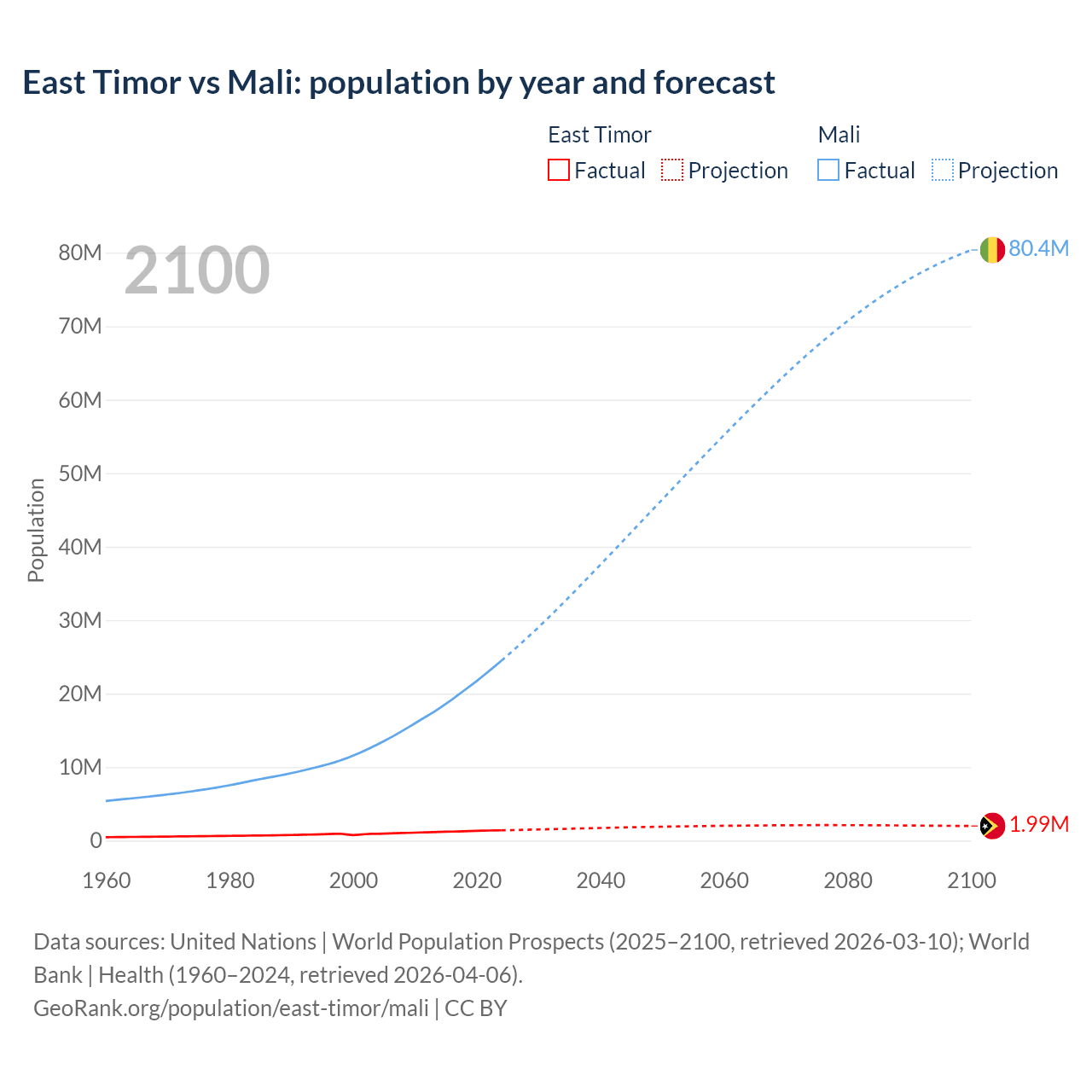 East Timor vs Mali: population by year and forecast
