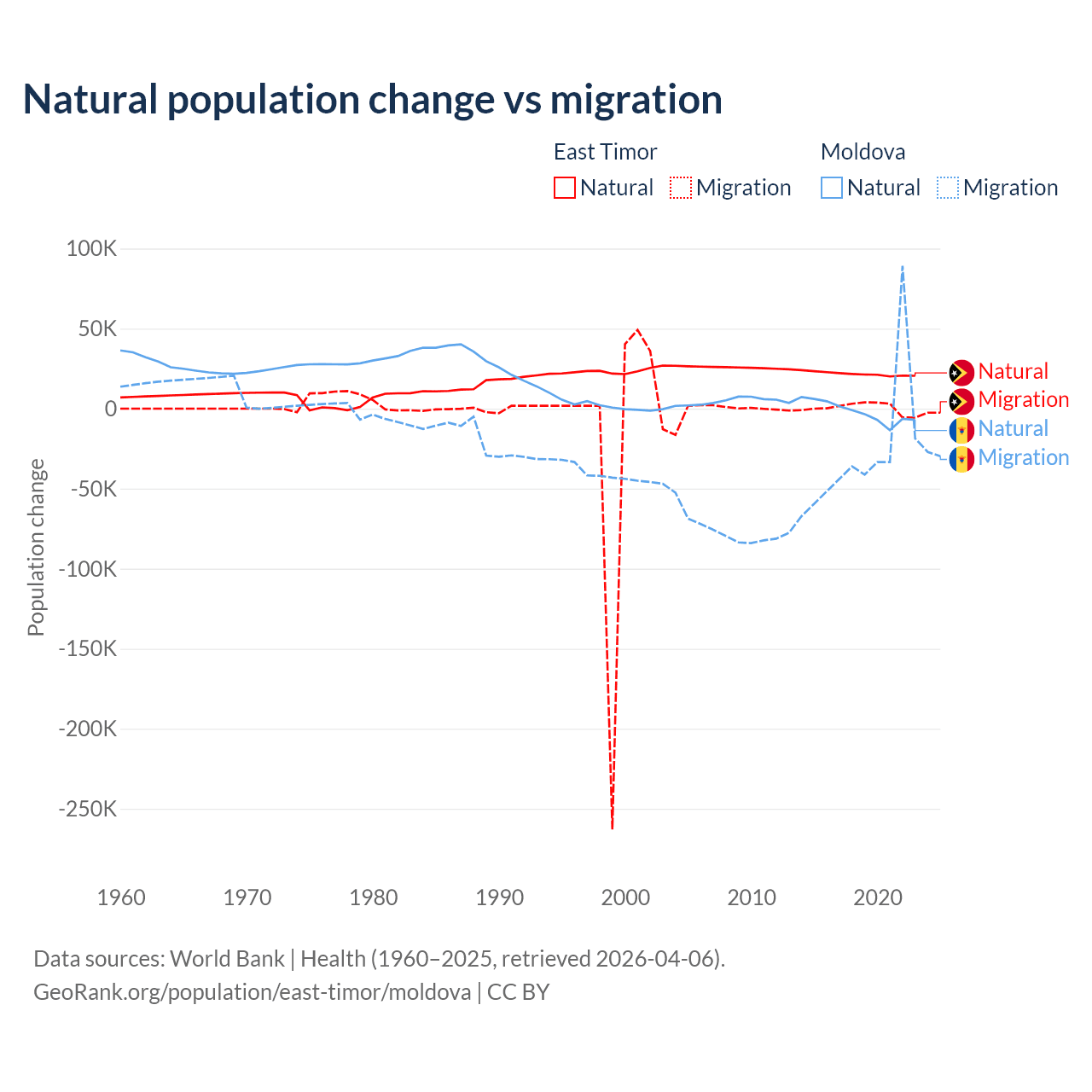 Over the last 10 years, 98.3% of the population change in East Timor is from natural causes (a gain of 217,698 people) and 1.66% is from migration (a gain of 3,665 people). In Moldova 6.04% is from natural causes (a loss of 19,001 people) and 94% is from migration (a loss of 295,631 people).