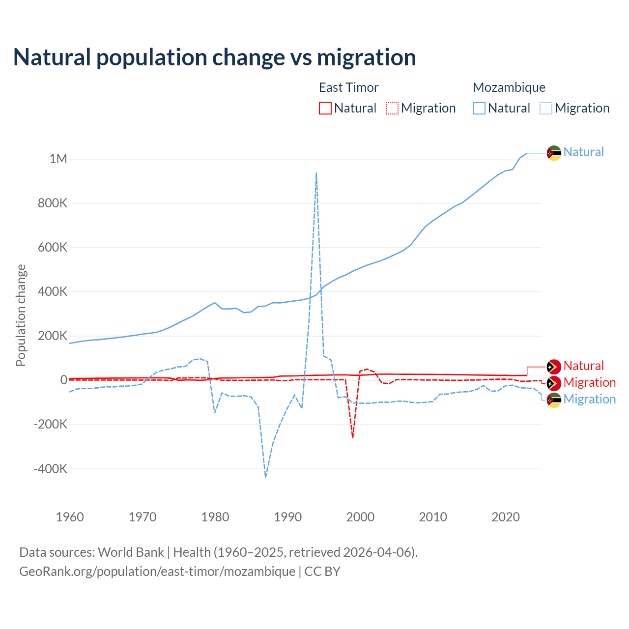 Over the last 10 years, 98.3% of the population change in East Timor is from natural causes (a gain of 217,698 people) and 1.66% is from migration (a gain of 3,665 people). In Mozambique 95.9% is from natural causes (a gain of 9,108,203 people) and 4.15% is from migration (a loss of 393,923 people).