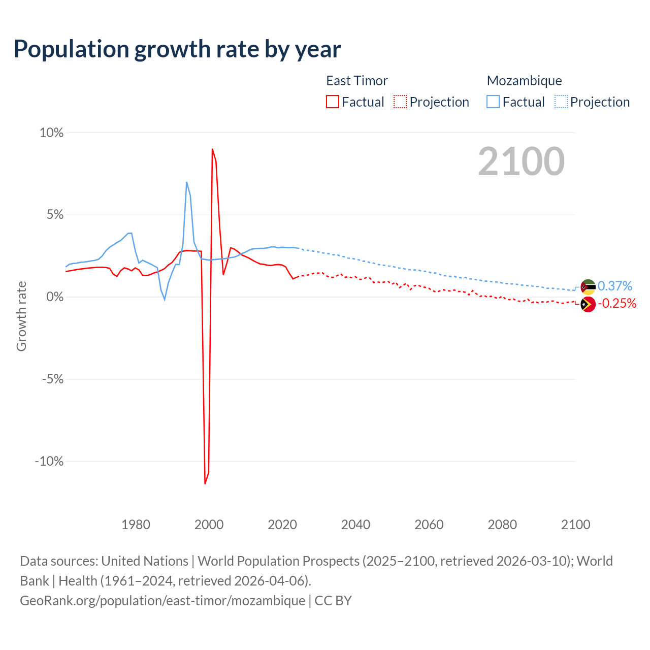 - For the last 10 years, East Timor has had an average growth rate of +1.74% per year vs +2.99% in Mozambique.