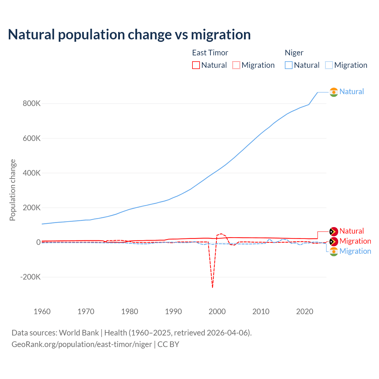 Over the last 10 years, 98.3% of the population change in East Timor is from natural causes (a gain of 217,698 people) and 1.66% is from migration (a gain of 3,665 people). In Niger 100% is from natural causes (a gain of 7,728,287 people) and 0.03% is from migration (a gain of 2,520 people).
