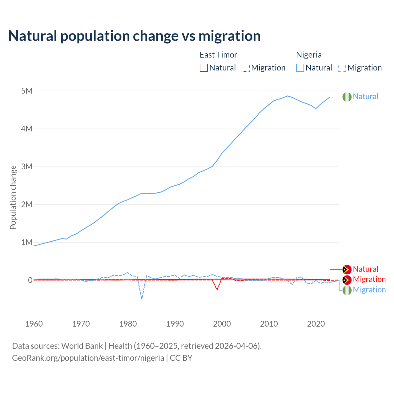 Over the last 10 years, 98.3% of the population change in East Timor is from natural causes (a gain of 217,698 people) and 1.66% is from migration (a gain of 3,665 people). In Nigeria 99.2% is from natural causes (a gain of 47,163,517 people) and 0.77% is from migration (a loss of 368,103 people).