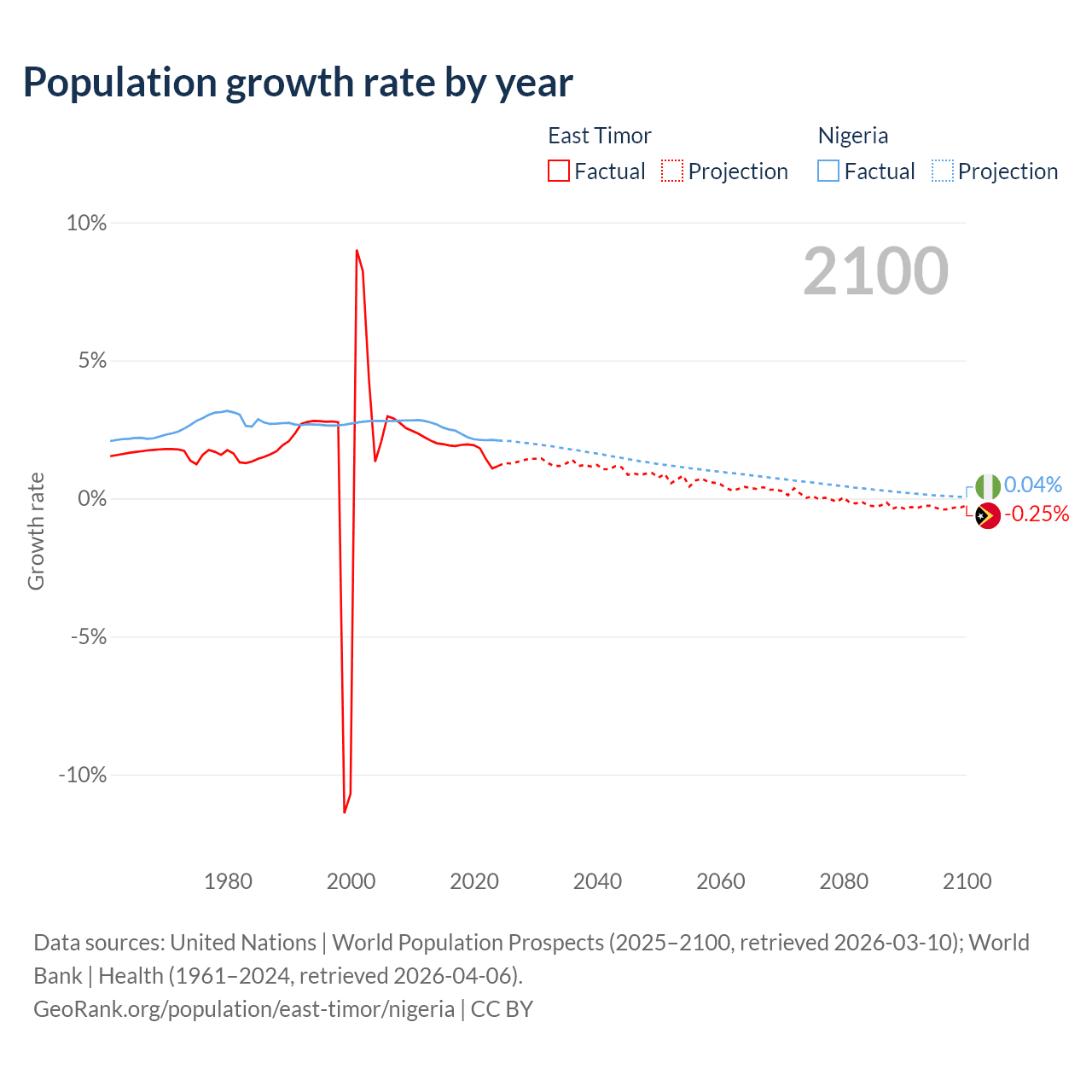 - For the last 10 years, East Timor has had an average growth rate of +1.74% per year vs +2.31% in Nigeria.