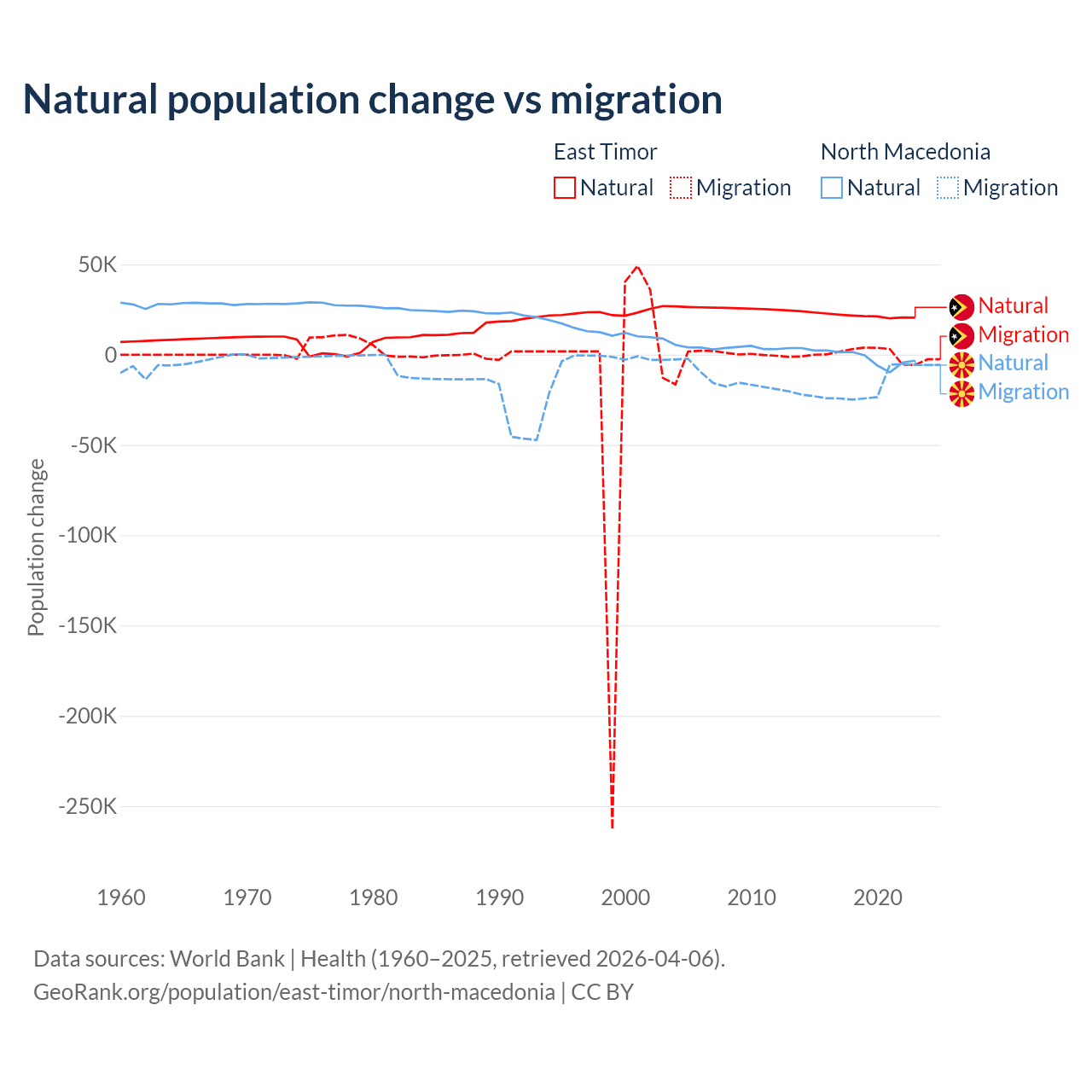 Over the last 10 years, 98.3% of the population change in East Timor is from natural causes (a gain of 217,698 people) and 1.66% is from migration (a gain of 3,665 people). In North Macedonia 6.45% is from natural causes (a loss of 12,585 people) and 93.5% is from migration (a loss of 182,429 people).