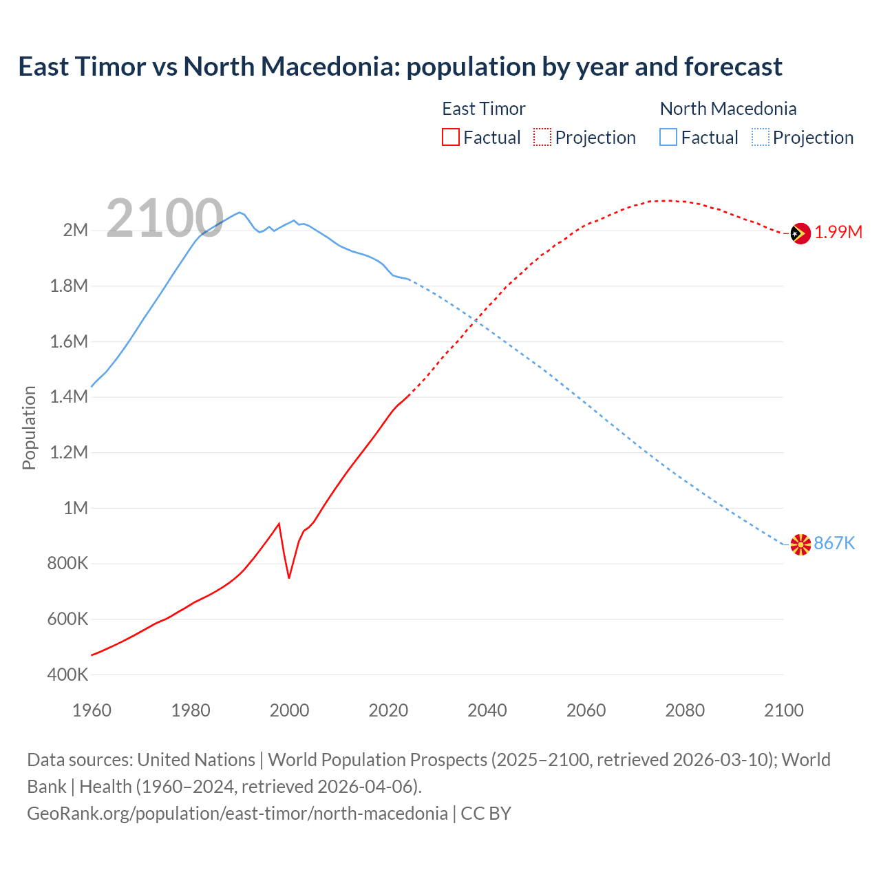 East Timor vs North Macedonia: population by year and forecast
