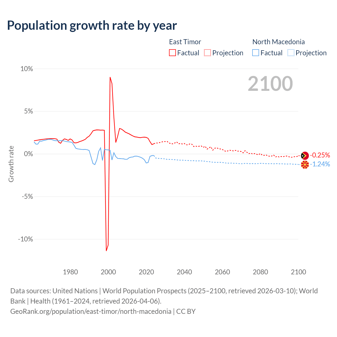 - For the last 10 years, East Timor has had an average growth rate of +1.74% per year vs -0.48% in North Macedonia.
