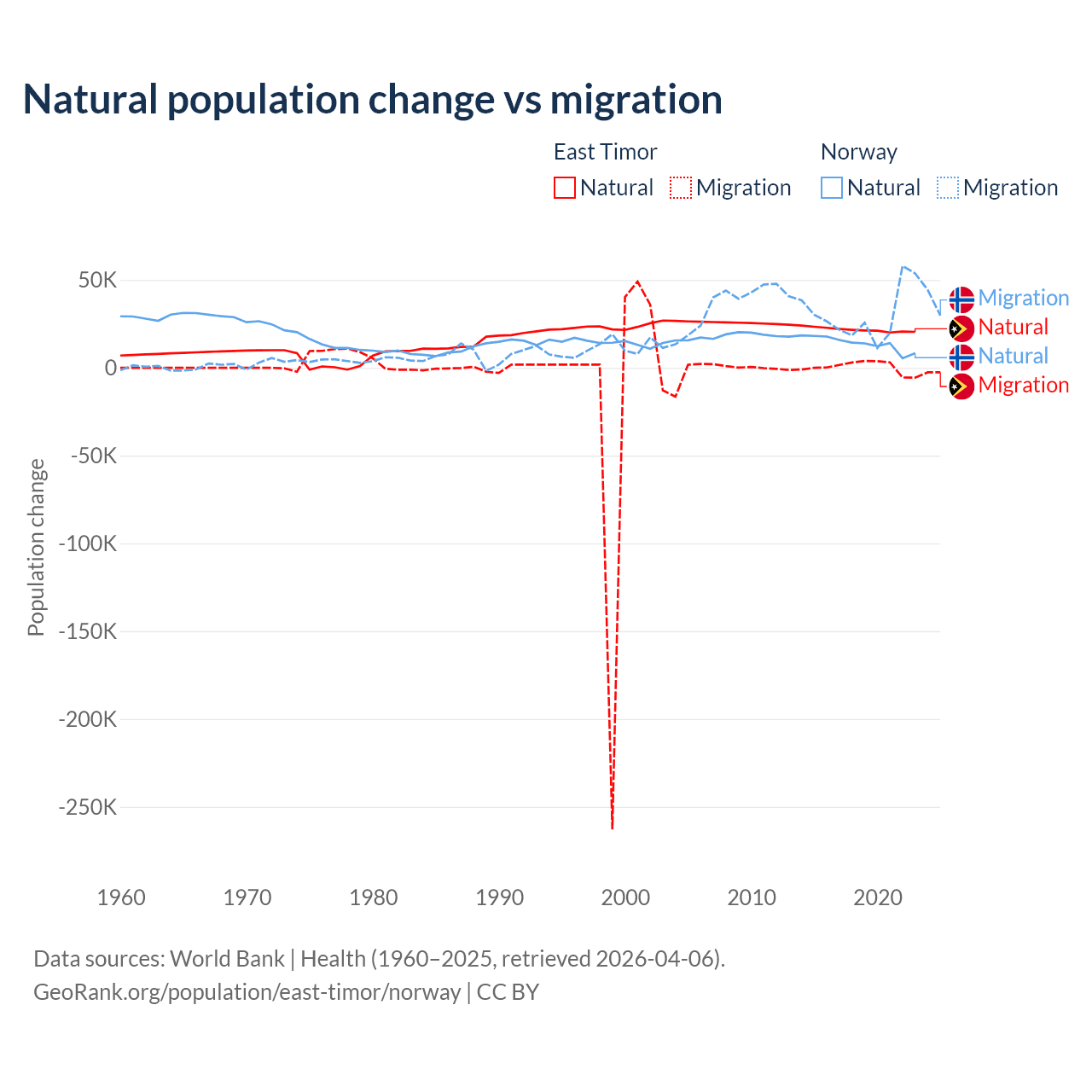 Over the last 10 years, 98.3% of the population change in East Timor is from natural causes (a gain of 217,698 people) and 1.66% is from migration (a gain of 3,665 people). In Norway 31.3% is from natural causes (a gain of 138,699 people) and 68.7% is from migration (a gain of 303,945 people).