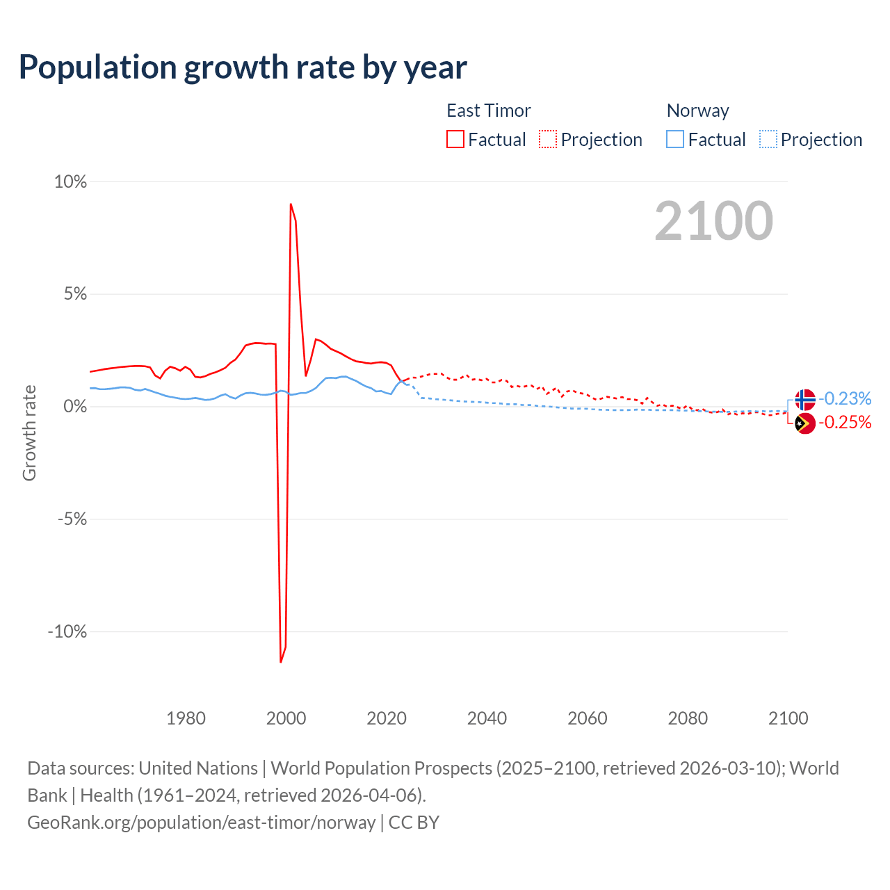 - For the last 10 years, East Timor has had an average growth rate of +1.74% per year vs +0.85% in Norway.