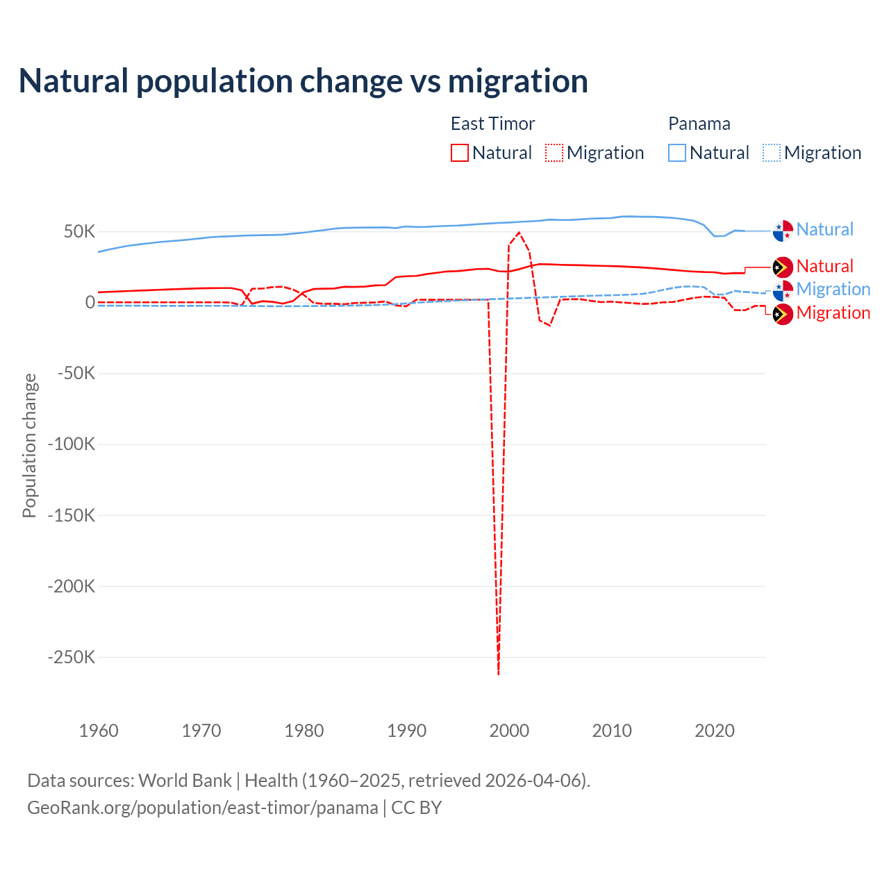 Over the last 10 years, 98.3% of the population change in East Timor is from natural causes (a gain of 217,698 people) and 1.66% is from migration (a gain of 3,665 people). In Panama 86.5% is from natural causes (a gain of 544,211 people) and 13.5% is from migration (a gain of 84,849 people).