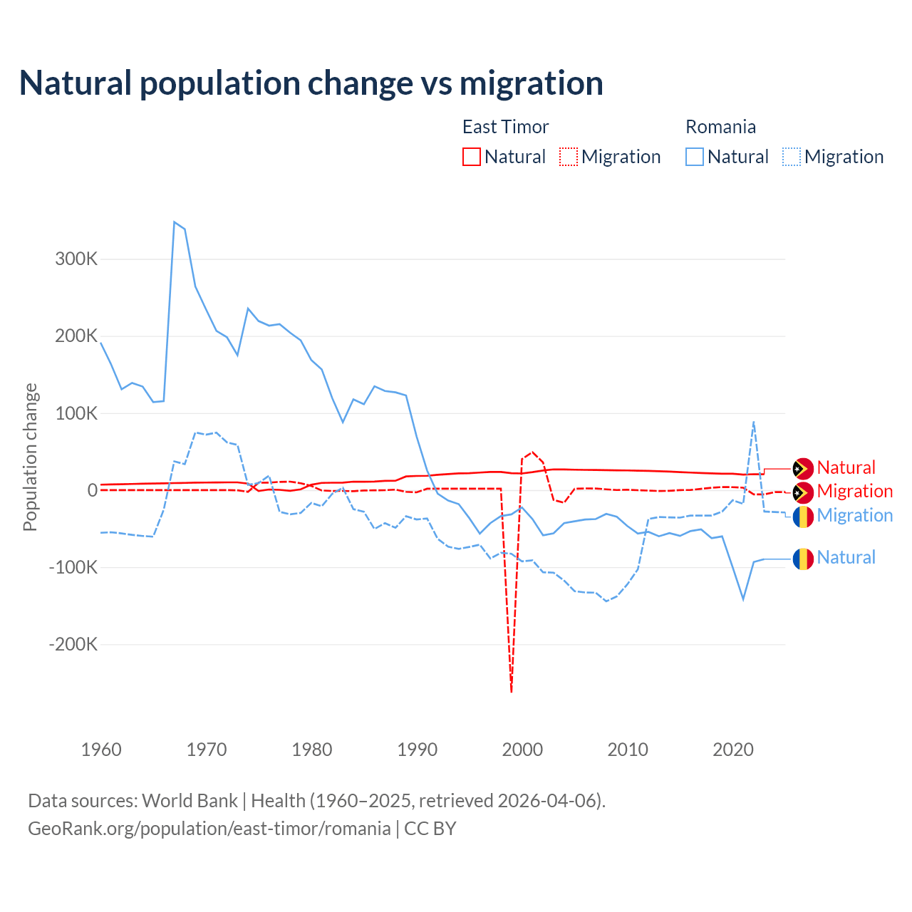 Over the last 10 years, 98.3% of the population change in East Timor is from natural causes (a gain of 217,698 people) and 1.66% is from migration (a gain of 3,665 people). In Romania 82% is from natural causes (a loss of 766,295 people) and 18% is from migration (a loss of 167,917 people).