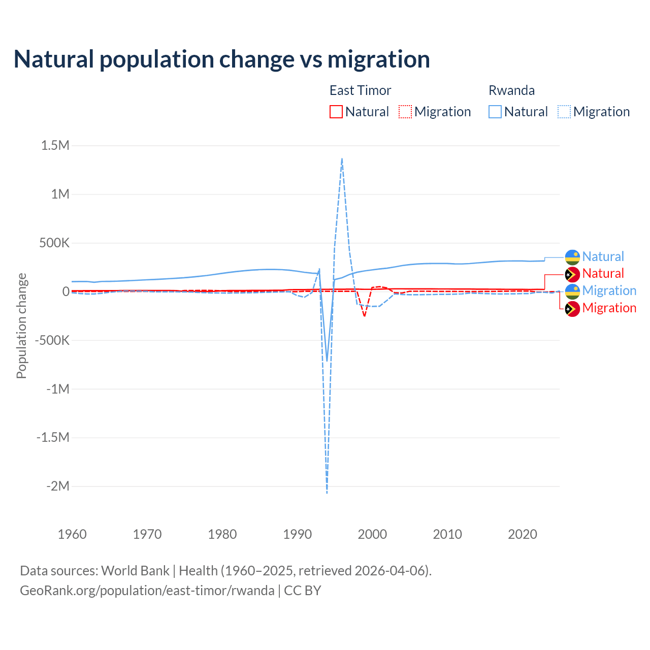 Over the last 10 years, 98.3% of the population change in East Timor is from natural causes (a gain of 217,698 people) and 1.66% is from migration (a gain of 3,665 people). In Rwanda 93.8% is from natural causes (a gain of 3,081,296 people) and 6.18% is from migration (a loss of 203,035 people).