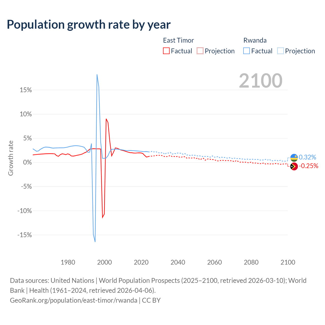 - For the last 10 years, East Timor has had an average growth rate of +1.74% per year vs +2.31% in Rwanda.