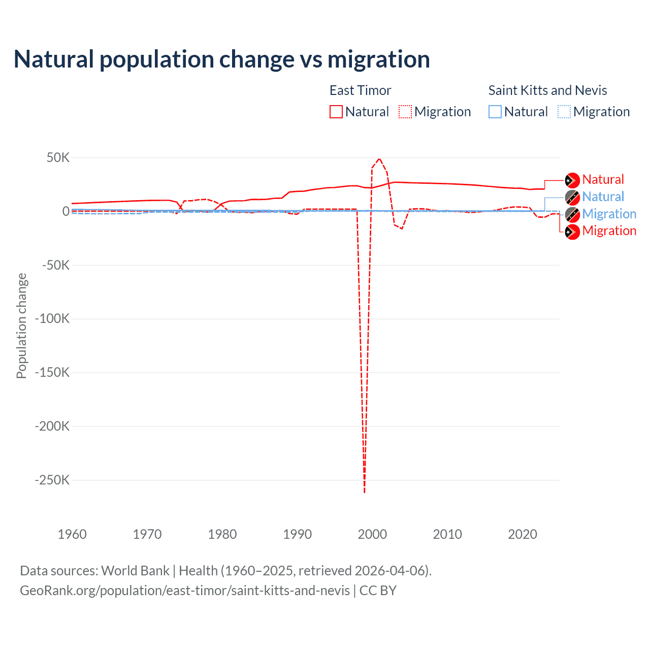 Over the last 10 years, 98.3% of the population change in East Timor is from natural causes (a gain of 217,698 people) and 1.66% is from migration (a gain of 3,665 people). In Saint Kitts and Nevis 44.9% is from natural causes (a gain of 1,225 people) and 55.1% is from migration (a loss of 1,506 people).
