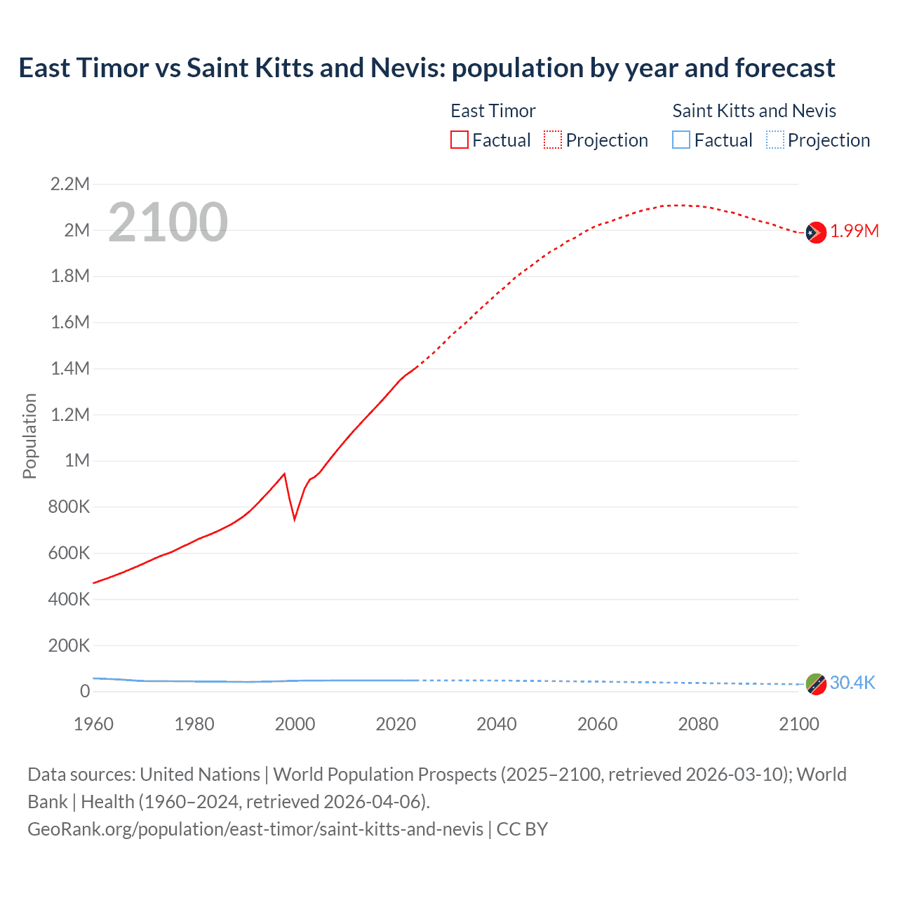 East Timor vs Saint Kitts and Nevis: population by year and forecast